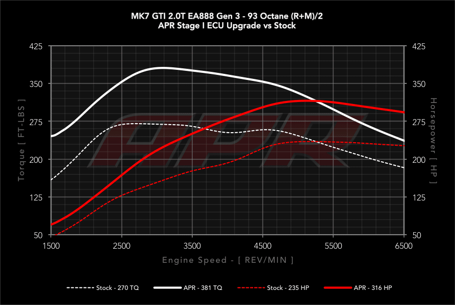 Wir empfehlen die APR Stage 1 den Kunden die keine bis wenige Hardwareänderungen möchten. Sie verhilft dem 4-Zylinder 2.0 TSI bereits zu stattlichen 320PS und 518Nm in der High Output Version mit 98 Oktan Kraftstoff. Dies ist ein weiterer APR Vorteil, denn es muss nicht zwingend 100+ Kraftstoff getankt werden da die Klopfregelung sehr präzise mit 98 oder wahlweise sogar auch mit 95 Oktan abgestimmt ist.